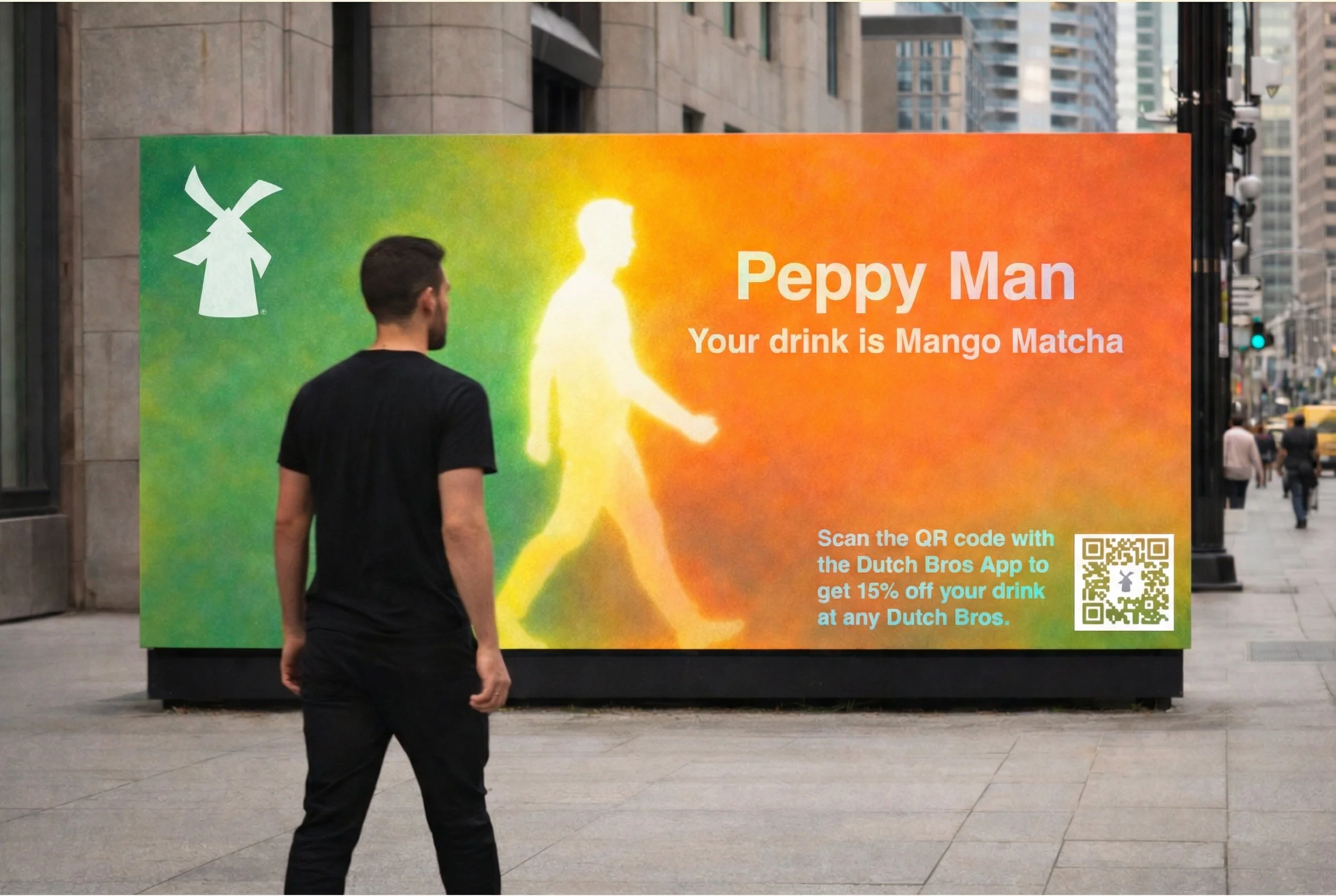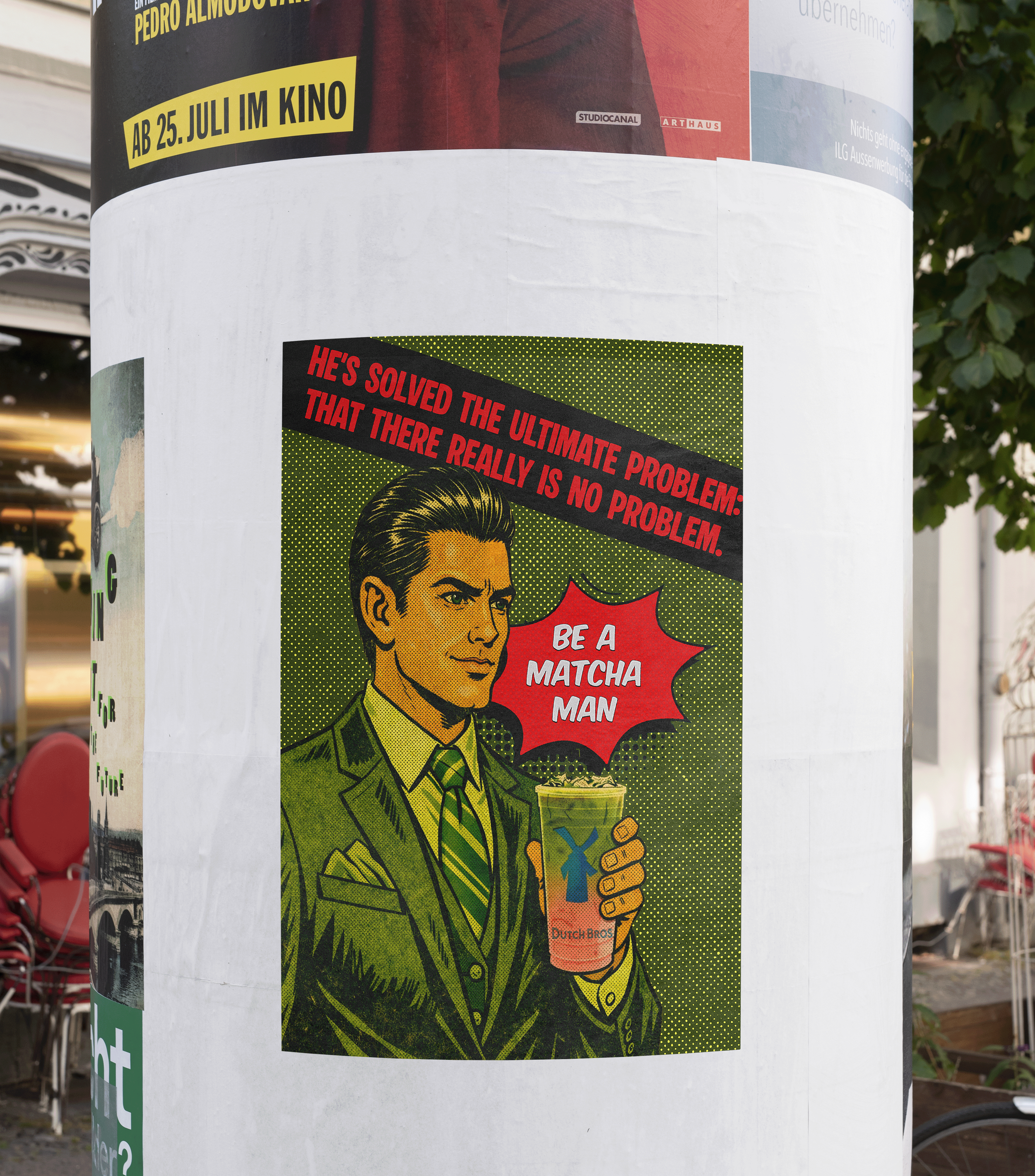 As you walk by these digital billboards, you’ll see what kind of matcha man you are by the aura you give off. If your aura is purple, then you’re a “calm man” and the Dutch Bros. lavender matcha is the drink for you.