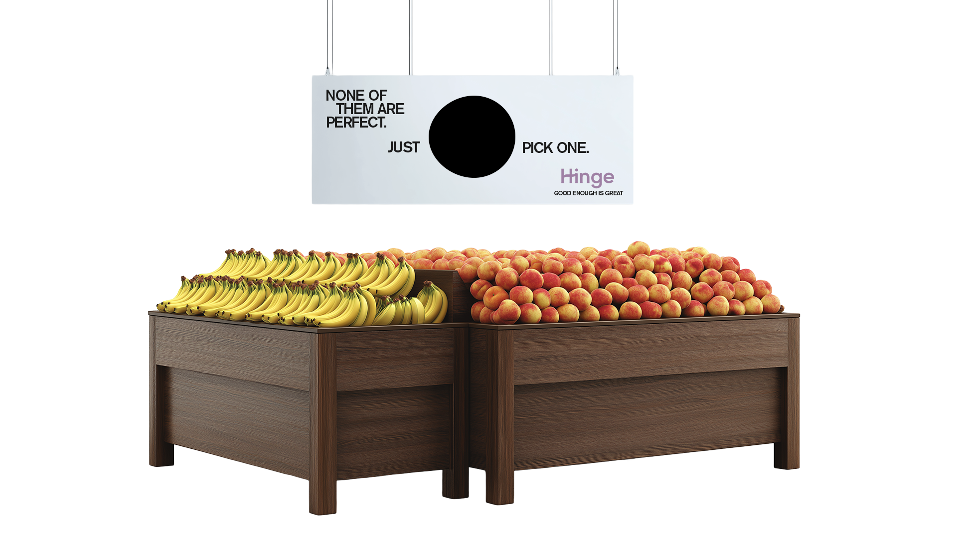Mac n’ cheese is both good enough and great, so we collab with Goodles to make imperfect circle noodles, with a QR code on the box to download Hinge, so you can find the cheese to your noodle.